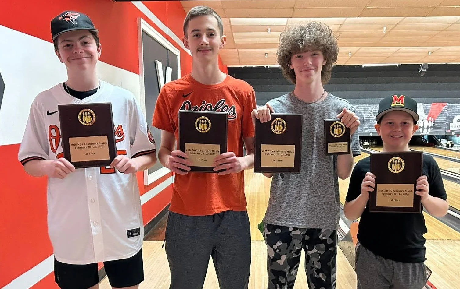 The NDYA Feb Match 2025 1st Place Team from Parkville Lanes of Bryn Brown, Zach Brown, Bricen Keita, and Ava Turner. Congratulations